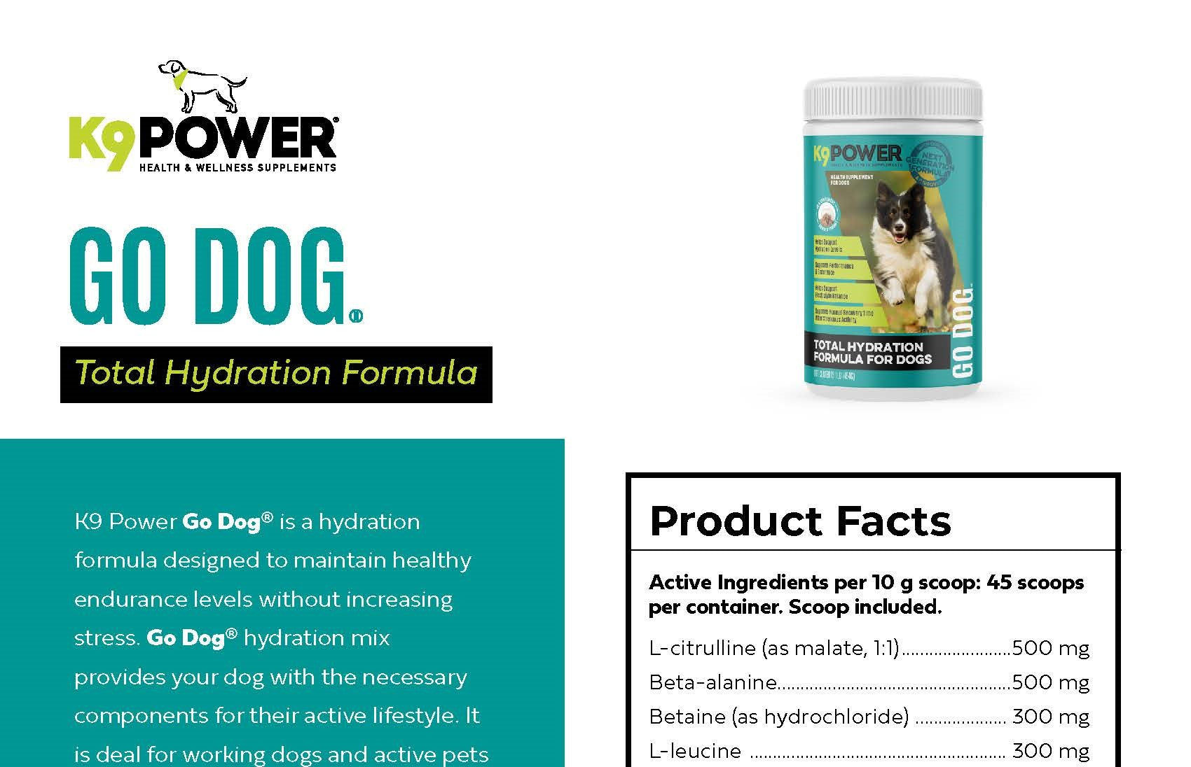 Go Dog is appropriate for any breed of dog that is active, no matter to what degree, especially in hot environments. Hydration is the single most important nutrient during activity and dogs are at an even higher risk when it’s hot. Virtually all metabolic reactions occur in the presence of water. Keep in mind that thirst is not an accurate indicator of fluid needs during activity! Dogs can be severely dehydrated, yet be too excited to drink water, or too stressed. Go Dog helps stabilize and replenish electrolytes and fluids that are depleted during activity with a mix of electrolytes and short-burst and long-range energy fuels designed to hydrate and help keep your dog in their performance safety zone. Proper hydration will keep your dog cool, healthy, and happy.