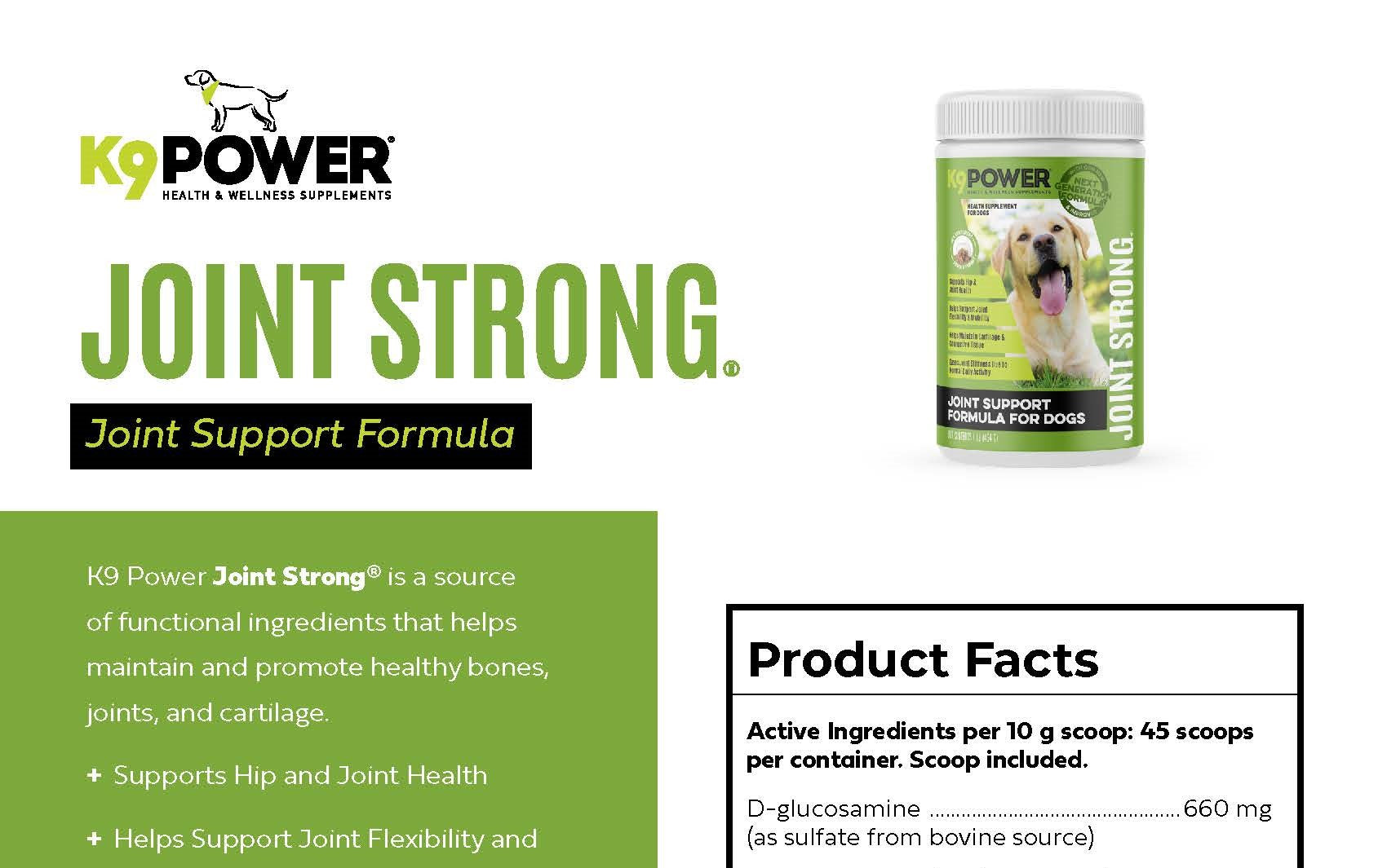 Joint Strong is effective for any dog, large or small, over the age of 6 months. Please refer to the scoop amounts on the label as the servings are dictated by the dog’s weight. Anytime you introduce a new supplement, we recommend introducing slowly at ½ recommended amount and work up to full amount over 7-10 days.